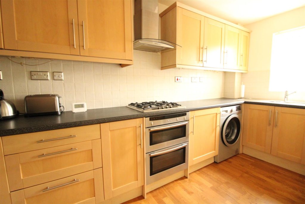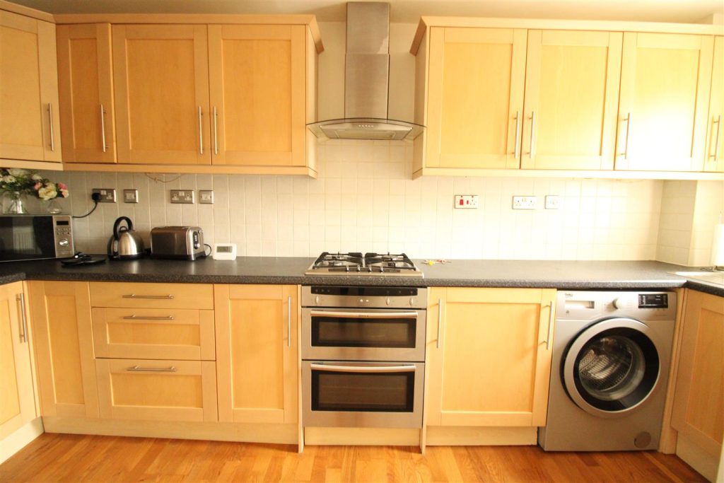 There is access to the kitchen area which has been fitted with a range of beech wall,floor and drawer cabinets complemented by matching wood effect work surfaces with a stainless steel sink unit.A host of appliances include an integrated electric oven and gas hob and there is a dishwasher and fridge freezer and washing machine.