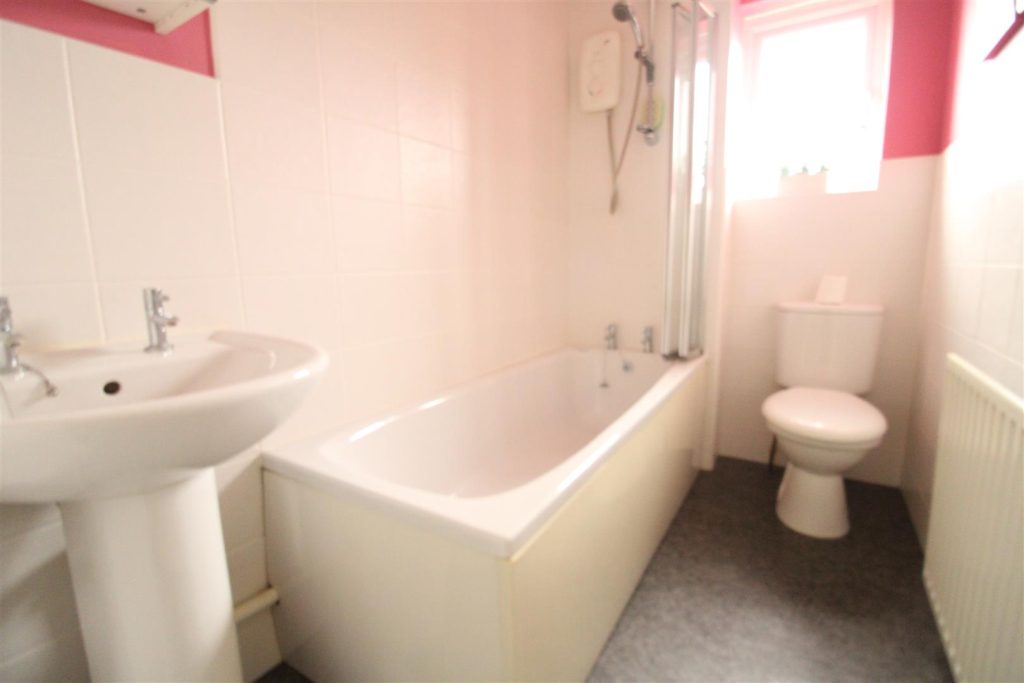 Fitted with a modern white suite to include a panelled bath which has an electric over the bath shower with folding screen. There is a pedestal hand basin and WC , The room has been finished with tiles and has a vanity mirrored cabinet