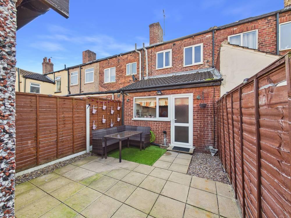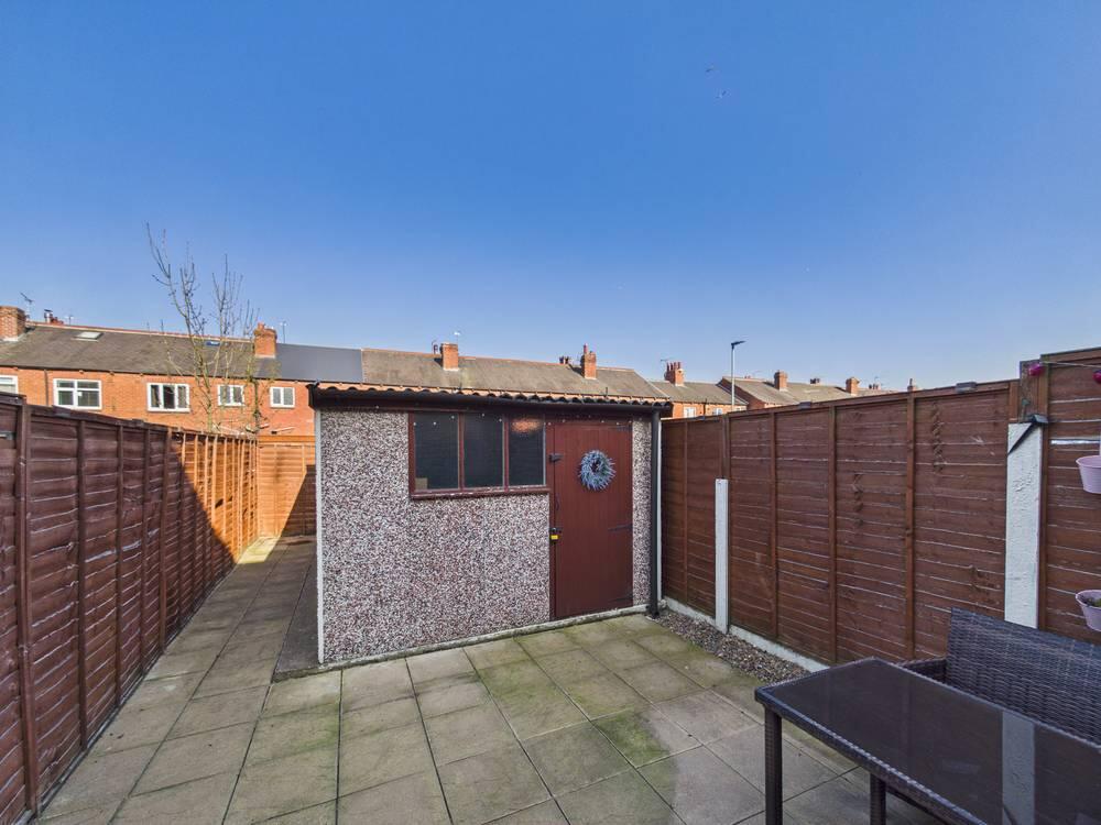 To the rear, the property benefits from a fully enclosed, low-maintenance garden, designed with a combination of paved patio areas and artificial lawn—ideal for outdoor dining and entertaining. Timber fencing provides privacy on all sides, while a useful garage sits at the end of the garden, offering excellent storage or workshop potential.