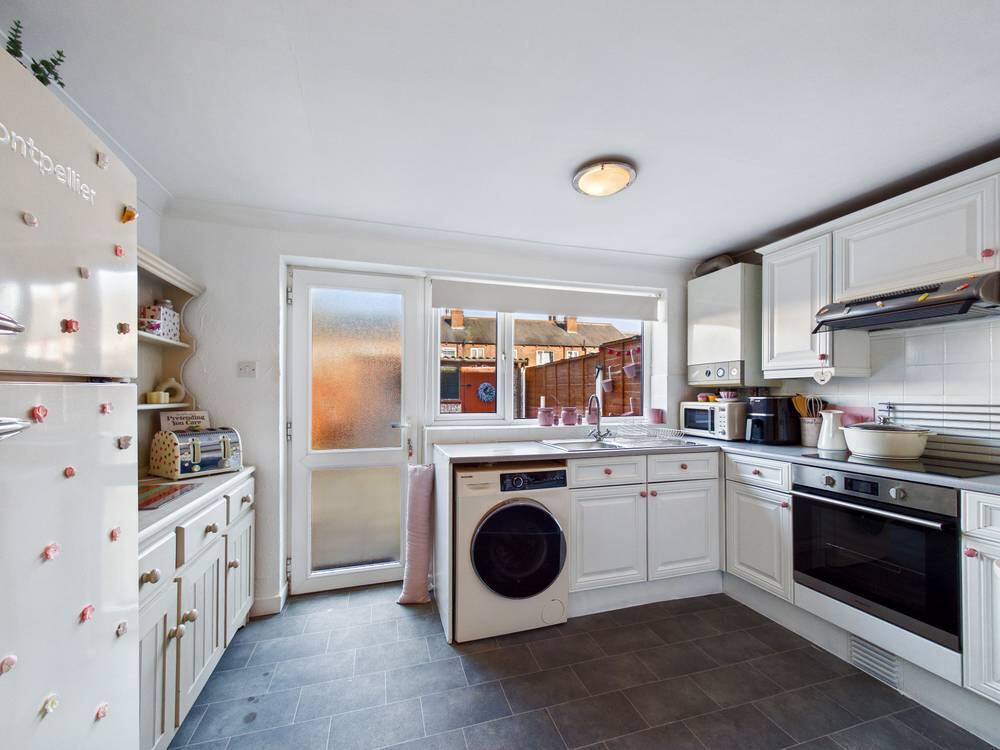 Range of high and low level kitchen units with integrated appliances including oven with electric hob and extractor fan. Sink with drainer and chrome tap over. Option to reconnect plumbing for washing machine. Space for fridge/freezer. UPVC access door to the rear. Tiled effect flooring. Central heated radiator. UPVC double glazed window to the rear.