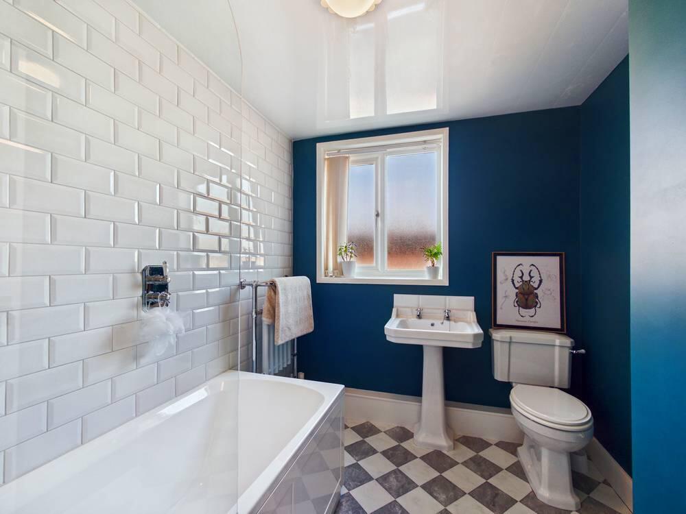 White suite comprising of WC with low level flush. Wash hand basin with chrome taps. Panel bath with chrome taps, shower screen and mains feed shower. Tiled effect flooring. Central heated radiator. UPVC double glazed frosted window to the rear aspect.